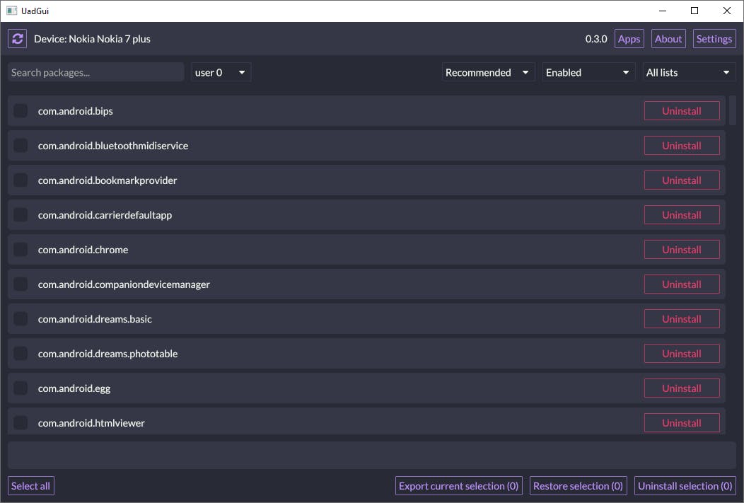 Als je de tool opstart via uad_gui-windows.exe zie je direct een flinke lijst met apps. Via de menu’s aan de bovenkant kun je eventueel die lijst verfijnen. In het eerste vak kun je naar een bepaald pakket zoeken. Het tweede vak (waar standaard user 0 staat), geeft je de mogelijkheid om apps voor een specifieke gebruiker te verwijderen. Dit is nieuw sinds release 0.3.