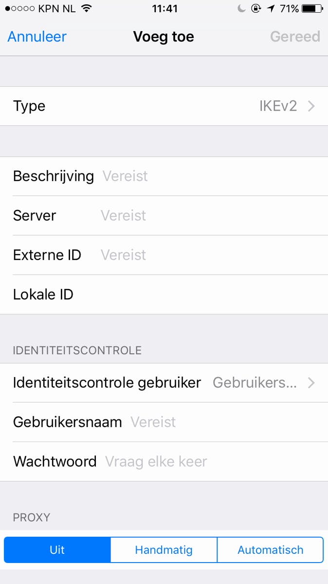 Standaard wordt een VPN-configuratie zonder proxy aangemaakt. Maar uiteraard kun je dit met je iPhone of iPad veranderen. Zorg er in dit geval voor dat je bij het aanmaken van de VPN-configuratie naar beneden scrolt en onder Proxy de optie Handmatig of Automatisch selecteert. Bij de eerste optie moet je de Server en de Poort opgeven en optioneel de schuif achter Identiteitscontrole aanzetten. Als je deze optie aanzet, moet je je Gebruikersnaam en Wachtwoord van de proxy opgeven.