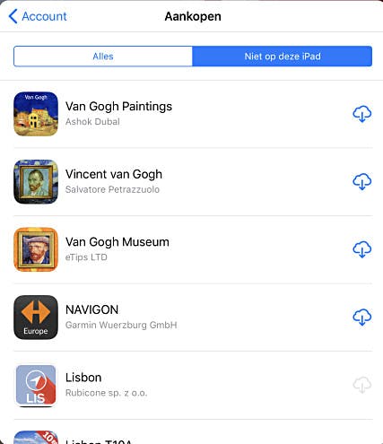 Start de App Store en zorg dat dit niet in de zoekmodus staat. Je ziet dan een klein blauw profiel in een cirkel rechtsboven in beeld. Tik hierop en daarna op Aankopen. Door vervolgens op de tab Niet op deze iPad te tikken zie je alle apps die niet (meer) geïnstalleerd zijn, maar waar je wel ooit voor betaald hebt. Ook de gratis apps die ooit geïnstalleerd waren vind je terug in dit rijtje. Het geheel is gesorteerd op download/installeervolgorde. Dus de nieuwste apps staan bovenaan. Klik op het 'downloadwolkje' en de app wordt weer geïnstalleerd.