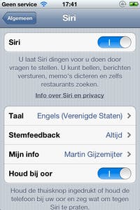 Siri is nu ingeschakeld en wanneer u nu de Thuisknop twee seconden ingedrukt houdt, zal de assistent worden geactiveerd. In dit instellingenscherm voor Siri kunt u aangeven welke taal u wilt gebruiken, maar ook of Siri de resultaten die zij genereert hardop moet voorlezen. Met behulp van de optie Houd bij oor kunt u aangeven of Siri ook geactiveerd kan worden wanneer u de telefoon bij uw oor houdt zonder te bellen, zodat u de Thuisknop niet ingedrukt hoeft te houden.