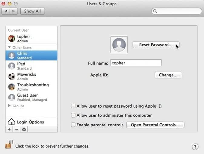 Om dit te doen klik je op het hangslot-icoontje in de Users & Groups-systeeminstellingen om te verifiëren en klik je vervolgens op het account waarop je niet kunt inloggen. Klik in de instellingen van het account op Reset Password om het wachtwoord ervan te veranderen.