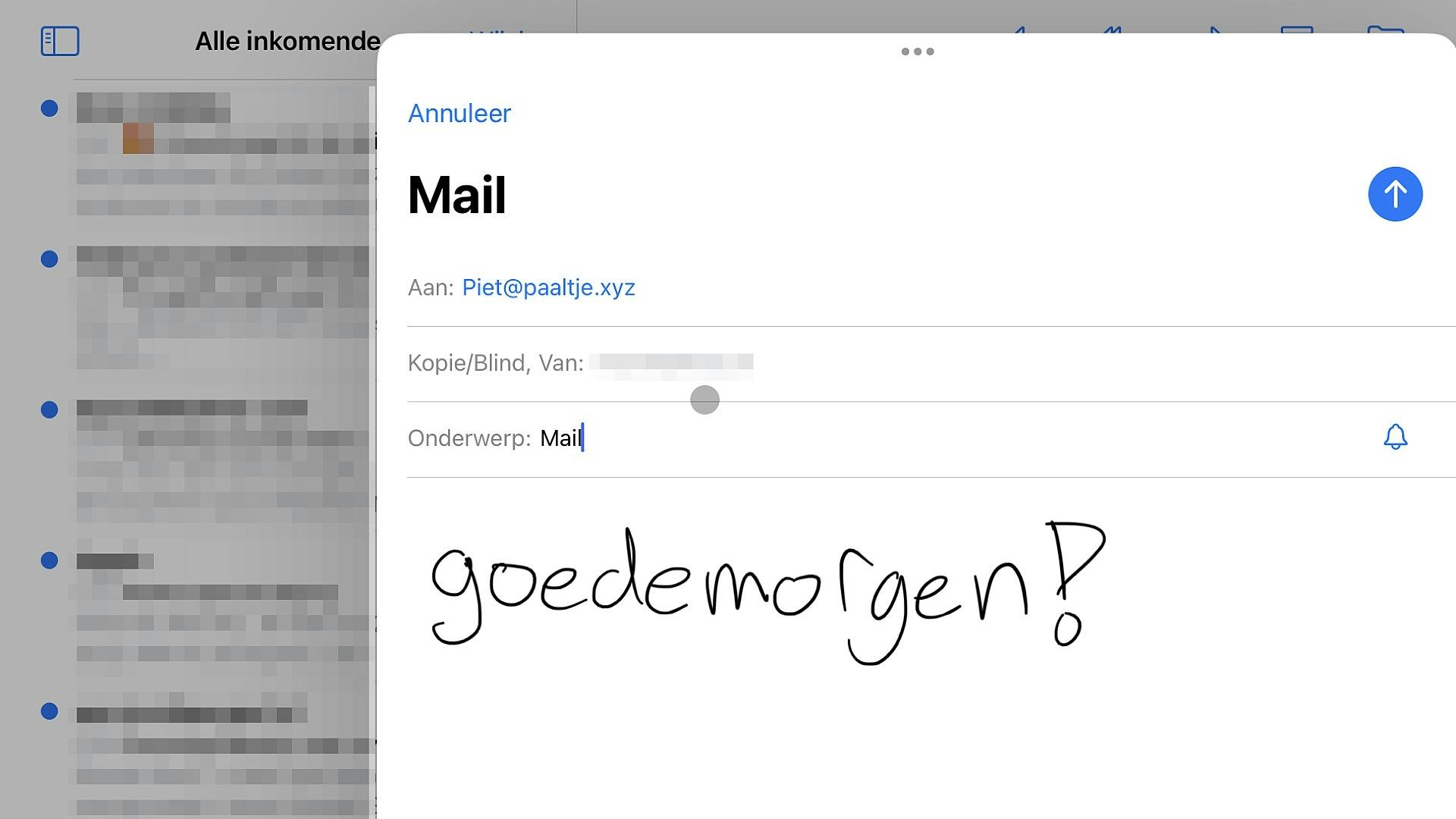 🍎 Tip: Geschreven mail Ook de Apple Mail-app in iPadOS beschikt over een teken/schrijf-module die de Pencil ondersteunt. Kwestie van in een nieuw berichtvenster rechtsonder op de pen tikken en schrijven maar! Weer eens wat anders dan een (volledig) getikte mail.
