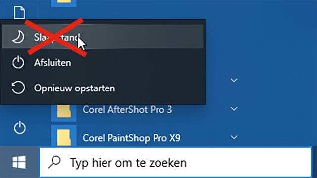 Wellicht komt het scenario je bekend voor. Aan het einde van je werkzaamheden wil je je Windows 10-pc afsluiten. Klik op de aan/uit-knop in het startmenu en vervolgens op Uitzetten. Echter: je was net iets te gehaast of je hand verschoof een beetje. En dus klikte je daarom ongemerkt op Slaapstand. Dat is met name vervelend als je je dit niet realiseert en vervolgens van een desktop-pc de netspanning afhaalt via bijvoorbeeld de schakelaar op stekkerdoos. Omdat het werkgeheugen nu niet meer onder spanning wordt gehouden, verdwijnen de slaapstandgegevens.