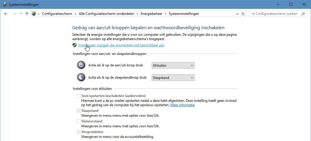 Klik in het menu Start van Windows 10 op Instellingen en in het daarop geopende venster op Systeem. Klik in de kolom links op Energiebeheer en slaapstand. Klik in het paneel rechts op Extra energie-instellingen. Klik - in alweer een nieuw venster - in de kolom links op Het gedrag van de aan/uit-knoppen bepalen. Je ziet an de rechterkant onder het kopje diverse lichtgrijs gekleurde en inactieve opties, wij hebben er daar eentje van nodig. Om ze te activeren, klik je op de link Instellingen wijzigen die momenteel niet beschikbaar zijn (wie zei er dat Windows 10 logisch in elkaar steekt...?). Schakel vervolgens het selectievakje voor de optie Slaapstand uit. Klik dan op de knop Wijzigingen opslaan en sluit het achterliggende venster. Vanaf nu wordt je startmenu niet meer ontsierd door de Slaapstand-optie. Het scheelt in ieder geval misklikken met mogelijk vervelende consequenties.