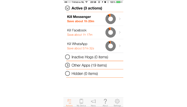 Druk op Active en je ziet niet alleen om welke apps het gaat, maar ook hoeveel tijd aan batterij je bespaart als je de apps afsluit (of ze verbiedt om informatie op de achtergrond te downloaden). Zo zie je in ons voorbeeld dat het afsluiten van Facebook Messenger, Facebook en WhatsApp al snel 3 uur en 40 minuten aan tijdswinst oplevert. Best schokkend. Het tabblad Other Apps toont je de apps die niet actief zijn, maar die ook bekend staan om het 'hoggen' oftewel, het leegslurpen van je batterij.