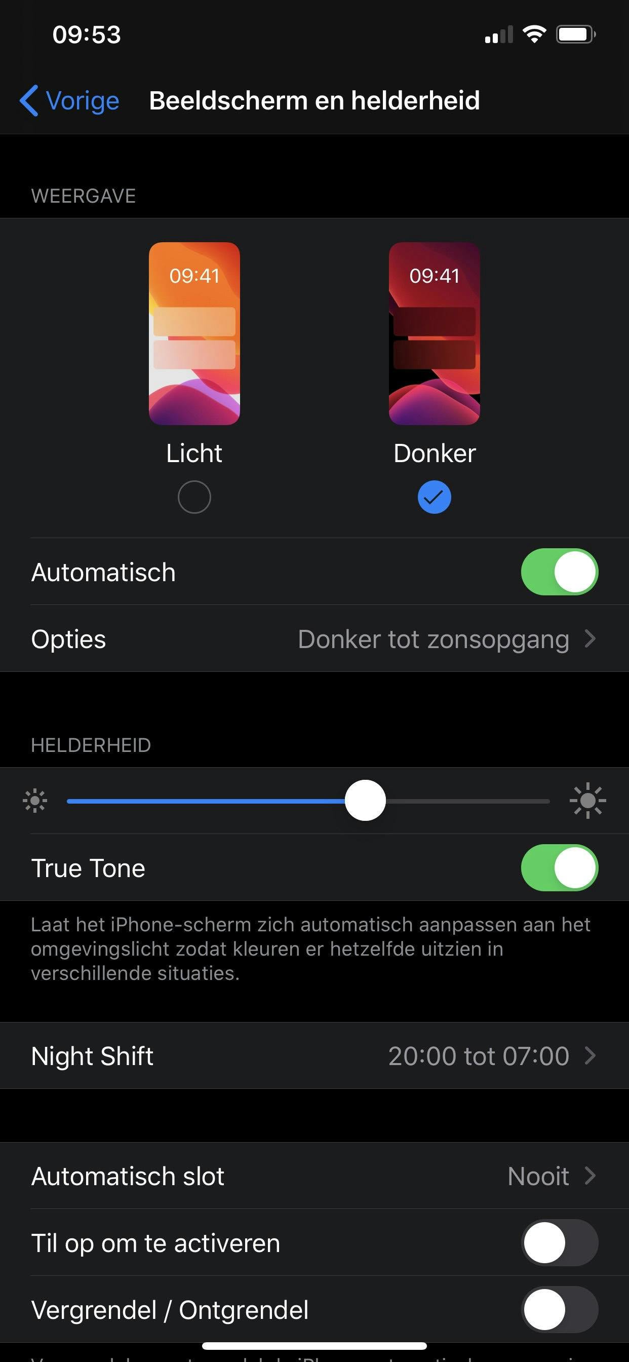 Bezitters van een iPhone hebben het makkelijk. WhatsApp neemt automatisch de donkere modus van je systeeminstellingen over. Kanttekening: je hebt wel minimaal iOS 13 nodig, op oudere iOS-versies is de optie er niet. Ga ervoor naar Instellingen, Beeldscherm en helderheid. Zet daar de optie Donker aan, mocht je dat niet al gedaan hebben. WhatsApp kleurt nu donker mee, je hoeft binnen de app zelf niets meer in te stellen.