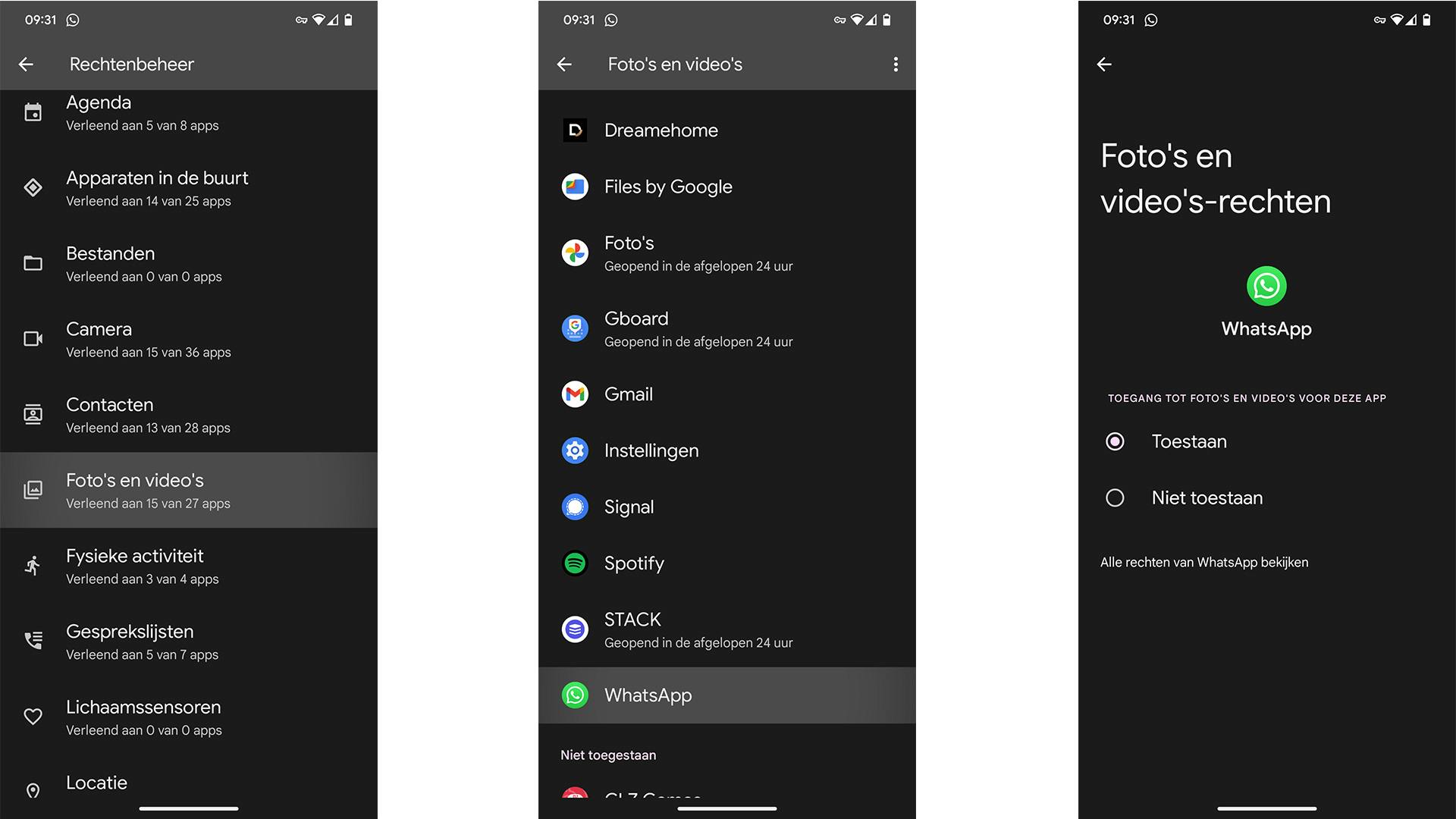 Vind je de stap hierboven een beetje spannend, geen probleem. Dan kunnen we gelukkig eerst nog de WhatsApp-rechten nalopen. Check bijvoorbeeld of WhatsApp wel de juiste rechten heeft, en bijvoorbeeld toegang heeft tot de opslag van je smartphone. Op Android ga je daarvoor naar Instellingen > Beveiliging en privacy > Rechtenbeheer Foto’s en video’s > WhatsApp. Op iOS ga je naar Instellingen > Privacy en beveiliging > Foto’s > WhatsApp.