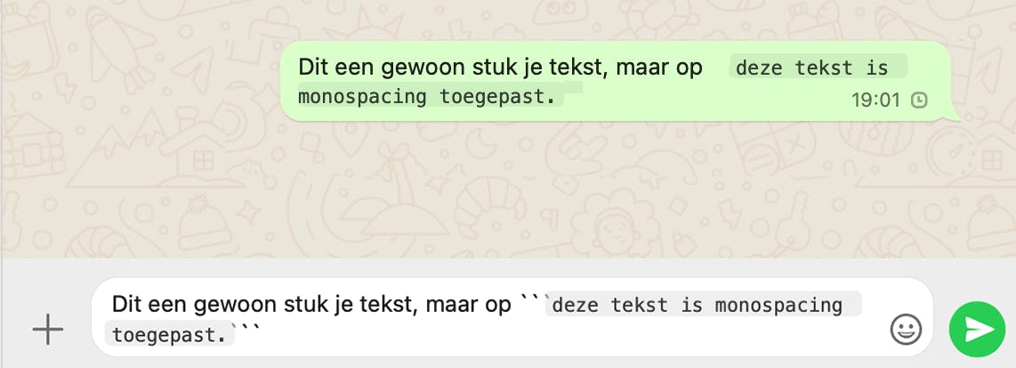 Uiteraard kun je deze teksttrucjes mixen in hetzelfde bericht. Zet bijvoorbeeld het ene woord in cursief en het andere in vet. Het is zelfs mogelijk om stijlen te combineren op hetzelfde stukje tekst. Als je bijvoorbeeld _*tekst*_ typt, dan komt dit woord zowel cursief als vet in beeld. Voeg je voor en achter nog een tilde toe, dus ~_*tekst*_~, dan krijg je dit: tekst.
