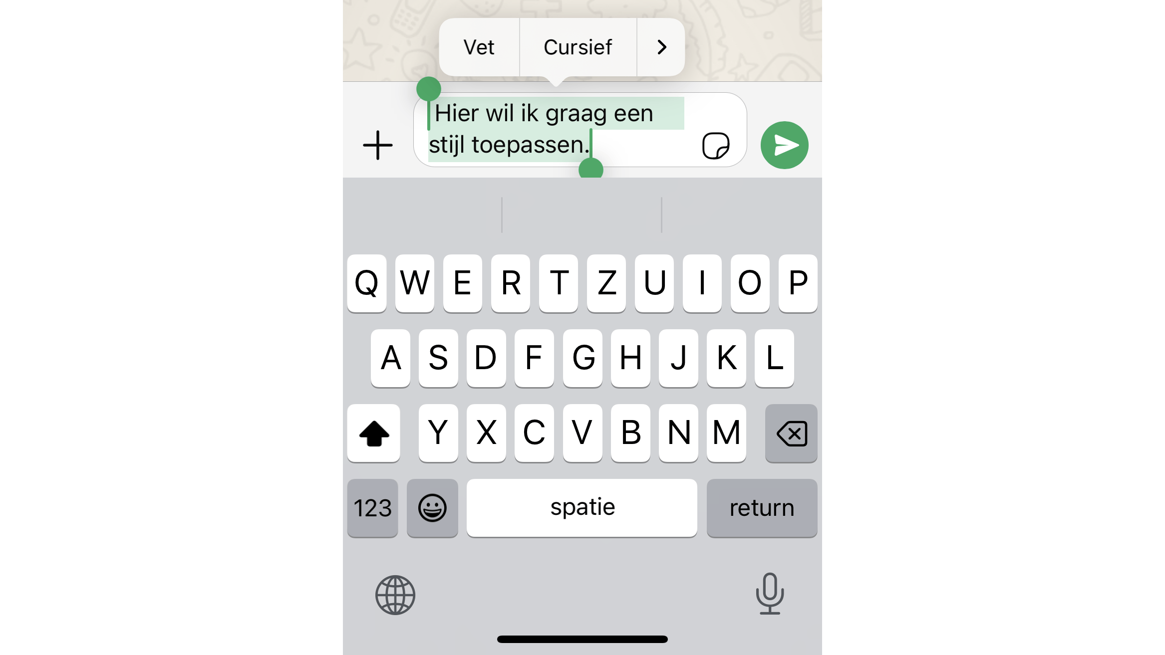 In WhatsApp kun je tekst prima vet, cursief en doorgehaald weergeven. Het enige wat je daarvoor hoeft te doen, is je tekst tussen speciale tekens plaatsen. Om een stukje tekst vetgedrukt te maken, plaats je een asterisk/sterretje (*). Deze zet je voor en na de tekst die je vetgedrukt wilt hebben. Tijdens het typen zie je dat de tekst tussen de asterisken vetgedrukt wordt, nog voordat je hem hebt verzonden. De ontvanger ziet de sterretjes natuurlijk niet.