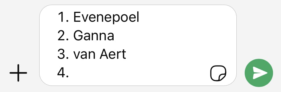 Heb je liever een genummerde lijst? Dat kan ook. Typ een nummer, bijvoorbeeld 1, gevolgd door een punt en een spatie en schrijf daarna het eerste item van je lijst. Wanneer je nu op Enter na het eerste item tikt, verschijnt het volgende nummer dat wacht op het volgende item in de lijst. Als je zou beginnen met een ander getal, bijvoorbeeld 7, gevolgd door een punt, dan plaatst WhatsApp meteen het volgende getal (dus 8) als je op Enter tikt.