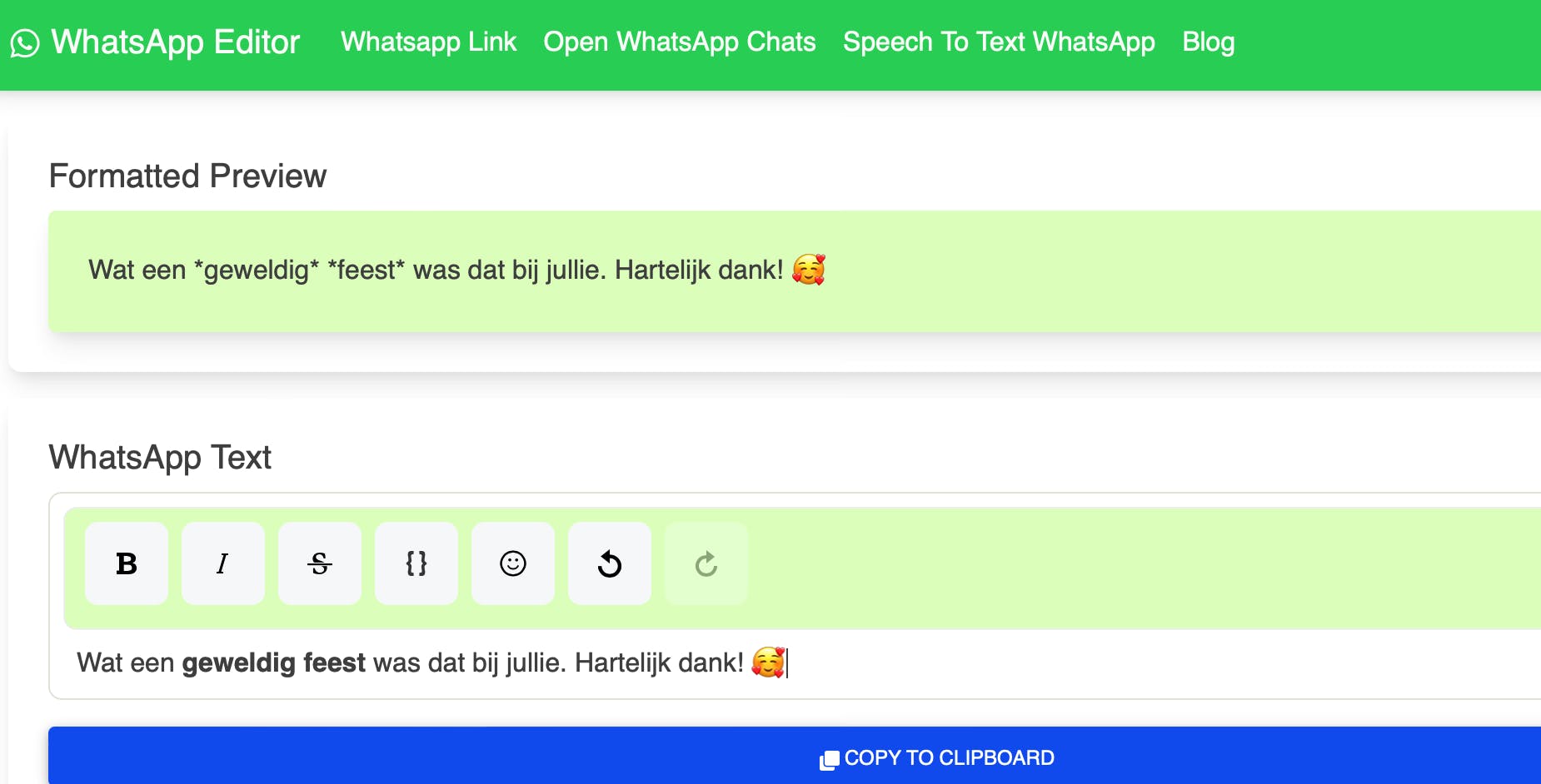 Je kunt de tekst gewoon in het tekstvak typen. Met de formatteerknoppen zet je stukjes tekst vervolgens in vet, cursief, onderstreept of monospace. In deze editor voeg je ook eenvoudig emoticons toe. Als de boodschap klaar is, klik je op de balk Copy to clipboard. Daarna plak je de opgemaakte boodschap in de app of de webversie van WhatsApp.