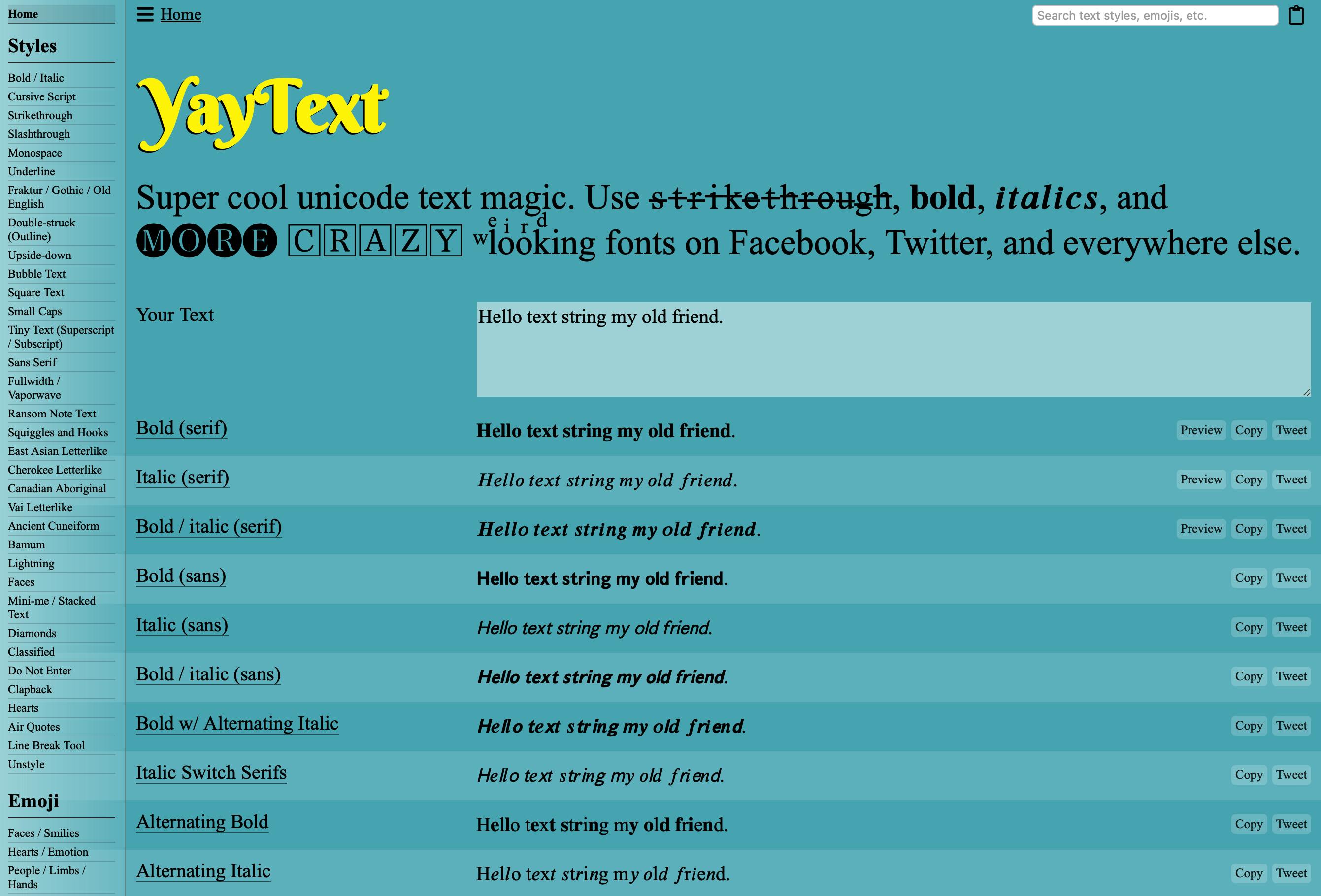 Als generatieve websites tippen we YayText waar het aanbod aan stijlen onuitputtelijk lijkt. Gelukkig zijn er in de linkerbalk de categorieën waardoor de keuze gemakkelijker wordt. Er is ook een bibliotheek met emoji voor de meest uiteenlopende onderwerpen.
