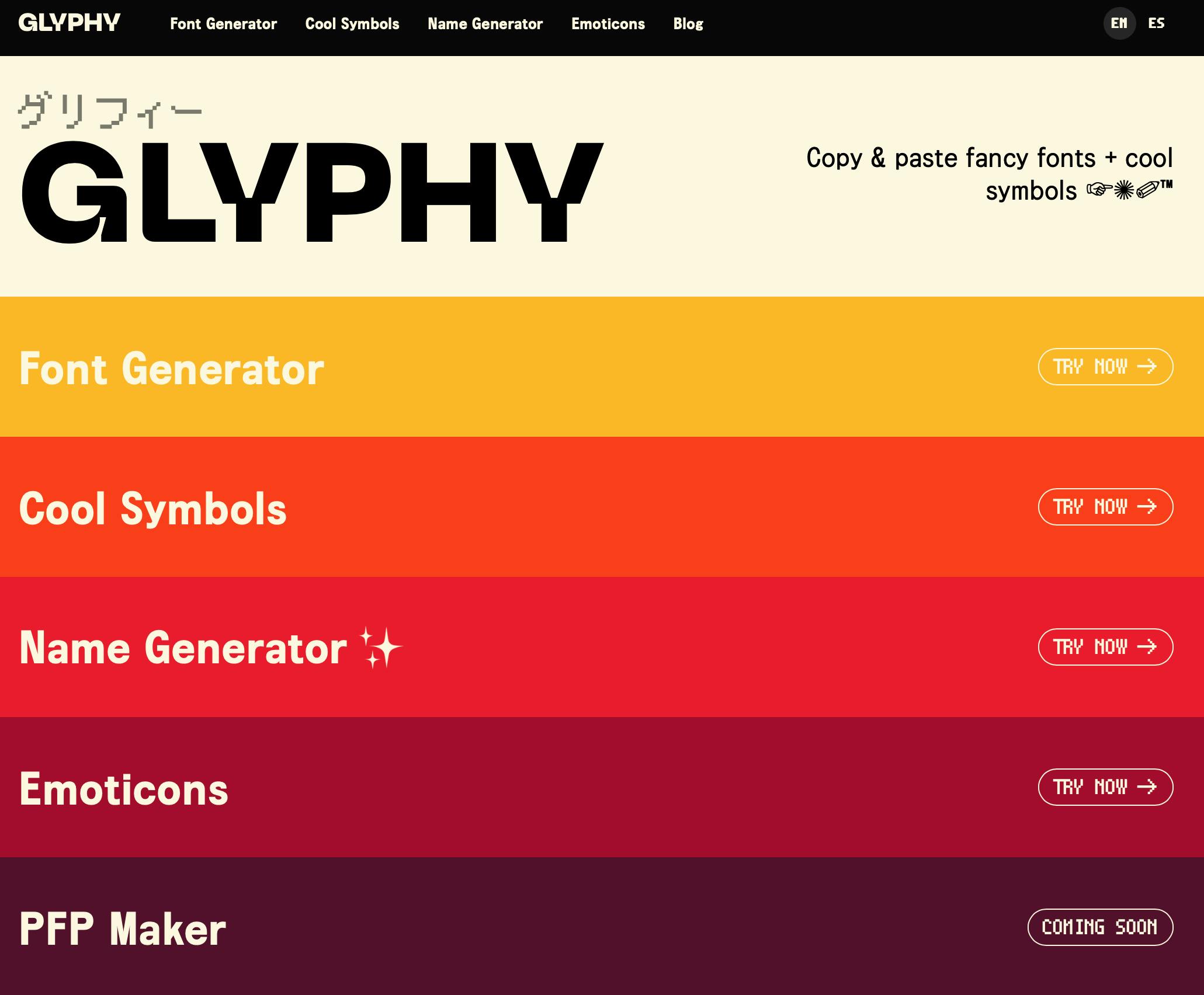 Een bijzondere generatieve website is Glyphy. Glyphy begint met een leuke Font Generator waar je de thema’s in de bovenbalk vindt. Het tweede luik zijn Cool Symbols die geordend zijn in sterren, pijltjes, hartjes, bloemen en sneeuwvlokken. Het derde luik gebruik je om een sterke gebruikersnaam voor sociale media te verzinnen. Je typt een naam, een woord en een gevoel en je bekijkt wat deze Username Generator ervan bakt.