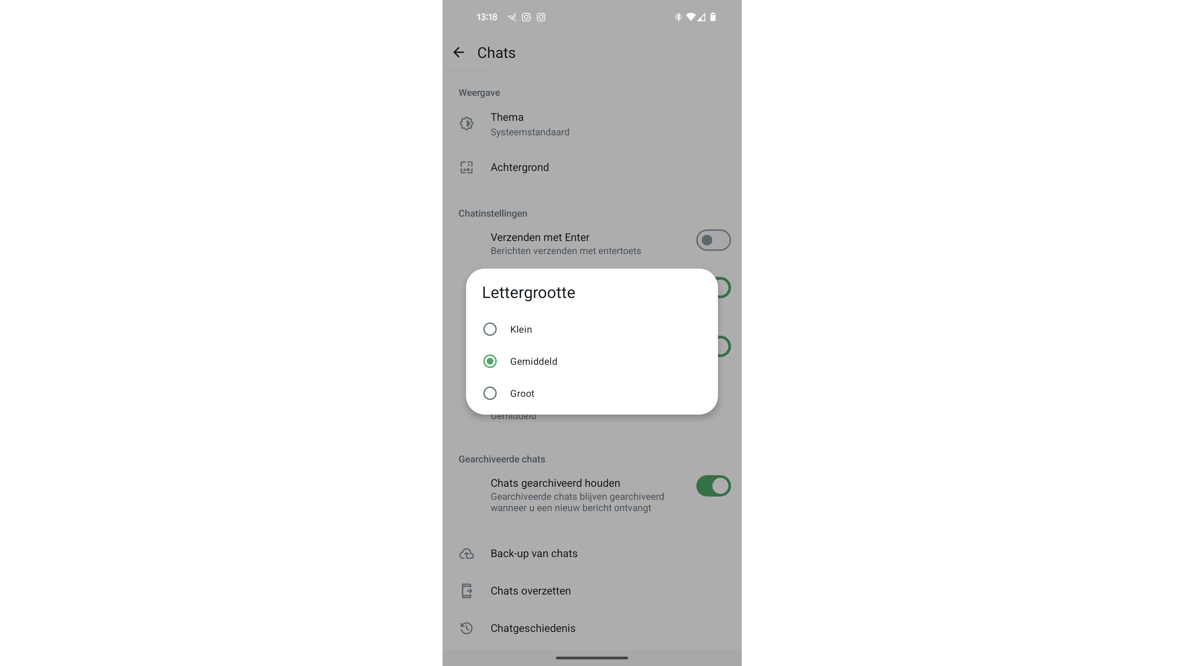 Worden je ogen er niet beter op en vind je het moeilijk om de WhatsApp-communicatie te lezen op je telefoon? Pas dan de lettergrootte aan. Op een Android-telefoon ga je hiervoor naar de Instellingen van WhatsApp. Dat doe je door op het pictogram met de drie stippen bovenaan te tikken. Onder het scherm Chatinstellingen staan verschillende opties. Kies de knop Lettergrootte. Daar kies je tussen kleine, middelgrote en grote tekstgrootte.