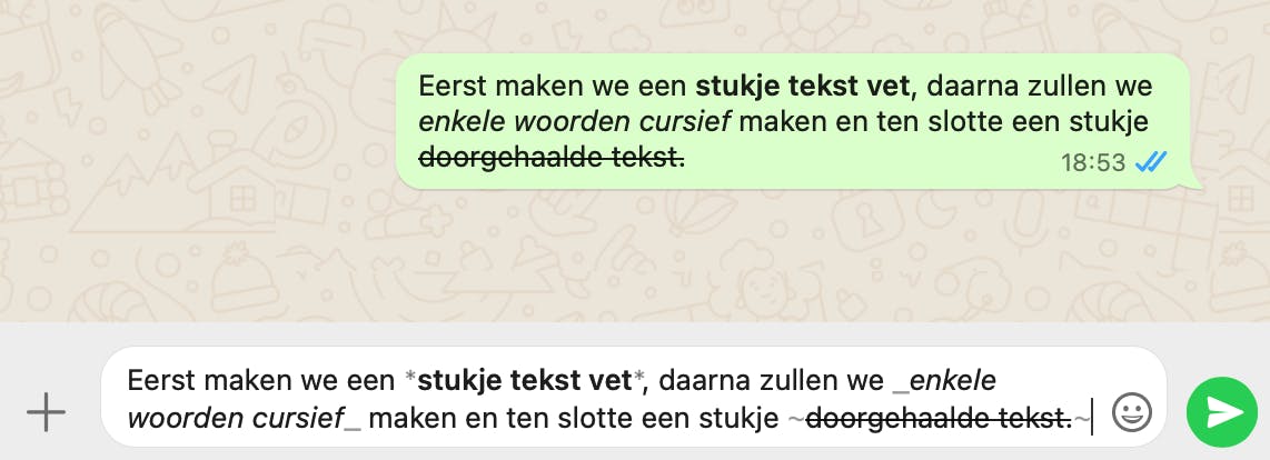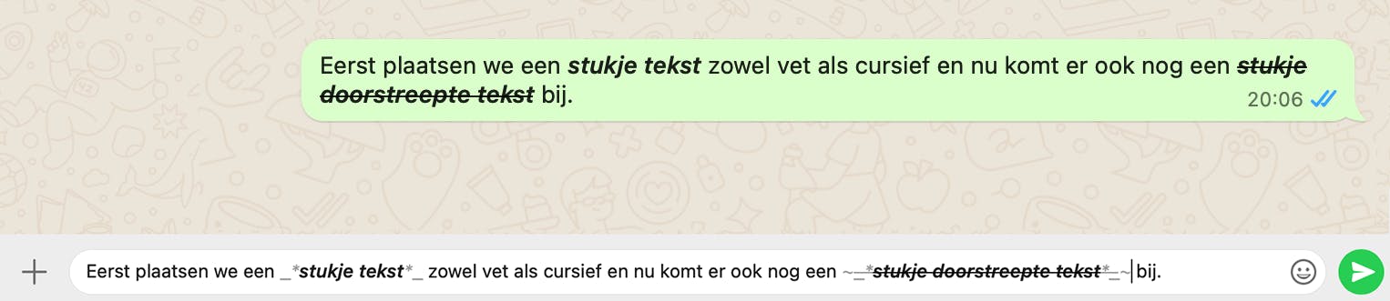 Om een tekst cursief te maken, gebruik je voor en na de tekst die je schuingedrukt wilt hebben, het onderstrepingsteken/underscore (_). Dat is bijvoorbeeld handig als je citaten typt in WhatsApp. Het is ook mogelijk om een stukje tekst door te halen. Hiervoor plaats je een tilde (~) aan beide kanten van de tekst.