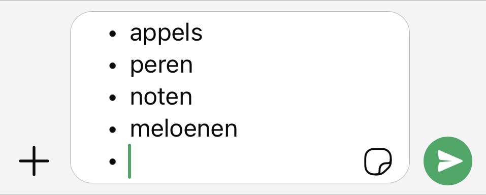 Wil je een lijstje naar iemand of naar jezelf sturen, dan kun je heel gemakkelijk opsommingstekens of bullets plaatsen. Sommige mensen gebruiken WhatsApp als notitie-app en sturen een bericht naar zichzelf om dingen niet te vergeten. Typ eerst een asterisk of een liggend streepje, dat maakt in dit geval geen verschil. Daarna moet je eraan denken om een spatie te typen en vervolgens typ je het eerste item. Tik vervolgens op Return of Enter. Daar zie je nu direct de tweede bulletpoint die wacht op het volgende item. Vanaf nu hoef je niet meer een liggend streepje met een spatie te typen, WhatsApp doet dit voor je.