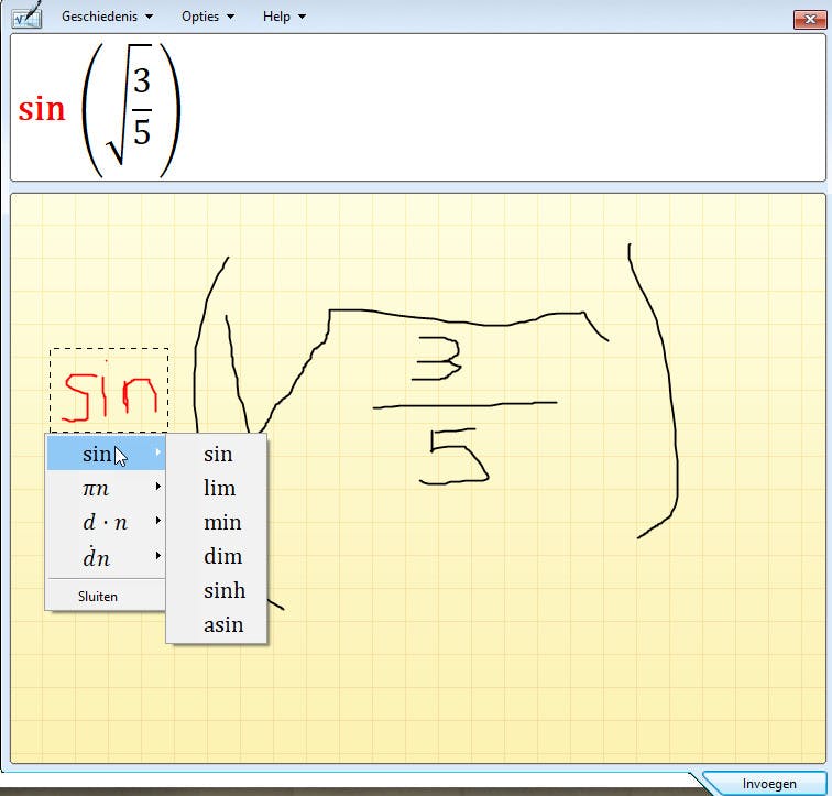 Om een formule in te voeren schrijf je in het daarvoor bestemde vlak. Tijdens het schrijven van de formule wordt dit indien nodig automatisch vergroot. Heel netjes hoef je niet eens te schrijven, zelfs ons met een trackbal (jawel, die bestaan ook nog) geproduceerde exemplaar wordt herkend. Mocht een deel van je formule niet (goed) herkend worden, dan klik je op de knop Selecteren en corrigeren. Teken een cirkel om het te corrigeren onderdeel en kies in het geopende menu een van de getoonde opties. Als daar nog steeds niet hetgeen je bedoelde in is te vinden, dan is het écht tijd om toch even een nieuwe poging te wagen. Daarvoor hoef je niet de hele formule opnieuw in te voeren. Klik op Wissen en gum het dwarsliggende deel weg. Na een klik op Schrijven herschrijf je het onderdeel.