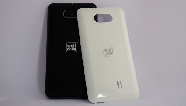 Als je het toestel voor het eerst in je hand neemt, merk je direct dat hij ontzettend licht is. Zelfs als je de accu in de telefoon hebt gestopt, weegt hij maar 140 gram. Dit maakt het vasthouden erg prettig. Het design is verder vrij saai en heeft veel weg van de andere Wolfgang-toestellen. Niet echt innoverend dus. Er zit zoals op elk Wolfgang toestel een zilverkleurige rand die langs het toestel loopt. De achterkant loopt iets af en is van simpel plastic. Natuurlijk ontbreekt, net zoals bij alle andere Wolfgang toestellen, het grote Wolfganglogo niet.