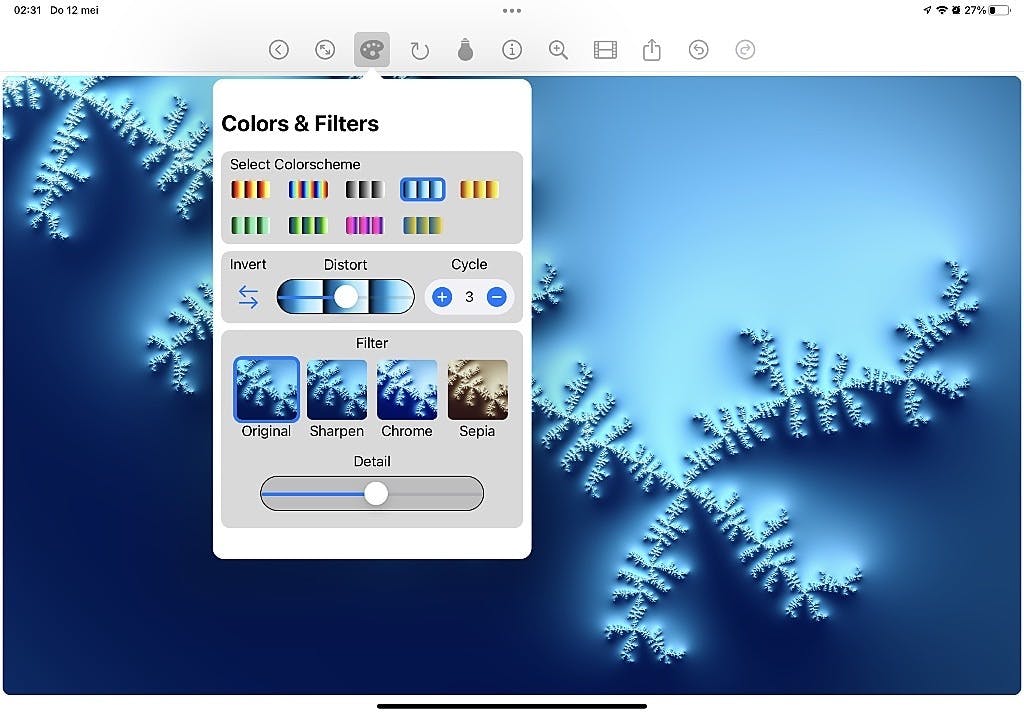 Wel is er een bibliotheek aan voorgedefinieerde fractals beschikbaar; tik daarvoor op de knop met de ‘filmstrip’ rechtsboven in beeld. Blijf verder van de export-knop weg, voor je het weet betaal je de genoemde €24,99. Als je een iPad gebruikt, volstaat een screenshot ook prima, zélfs voor afdrukken. Kortom: een mooie app, maar jammer van die kostbare export-functie.