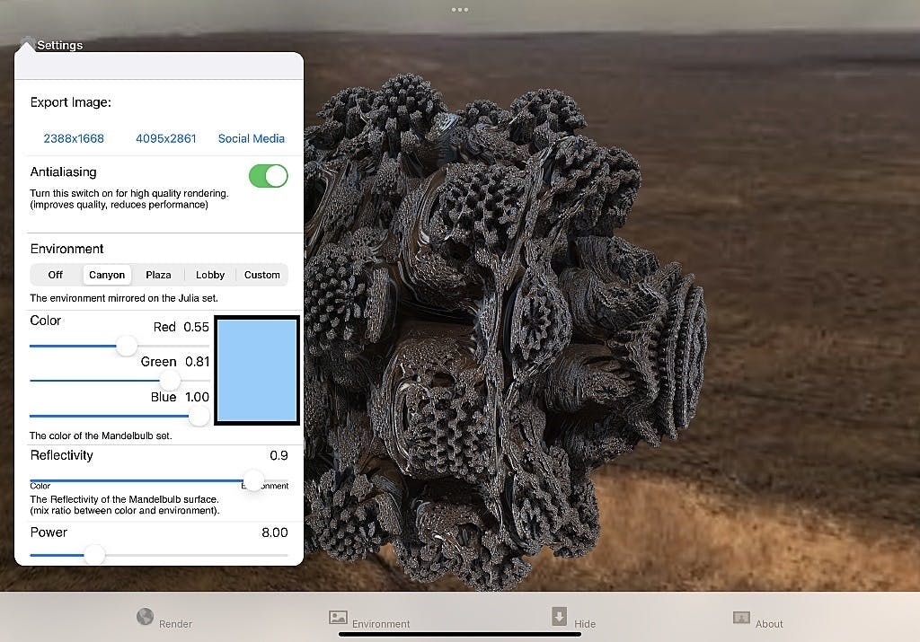 Final Fractal is iets minder ‘eye candy’ qua vloeiende bewegingen dan Frax. Staat tegenover dat je de volledige versie met alle features voor €0,99 koopt, dus da’s wel heel erg te overzien. Je kunt ook moeiteloos hires afbeeldingen op je apparaat renderen, tot en met 28 megapixel om precies te zijn. Dat is voor zelfs grootformaat-afdrukken meer dan voldoende.