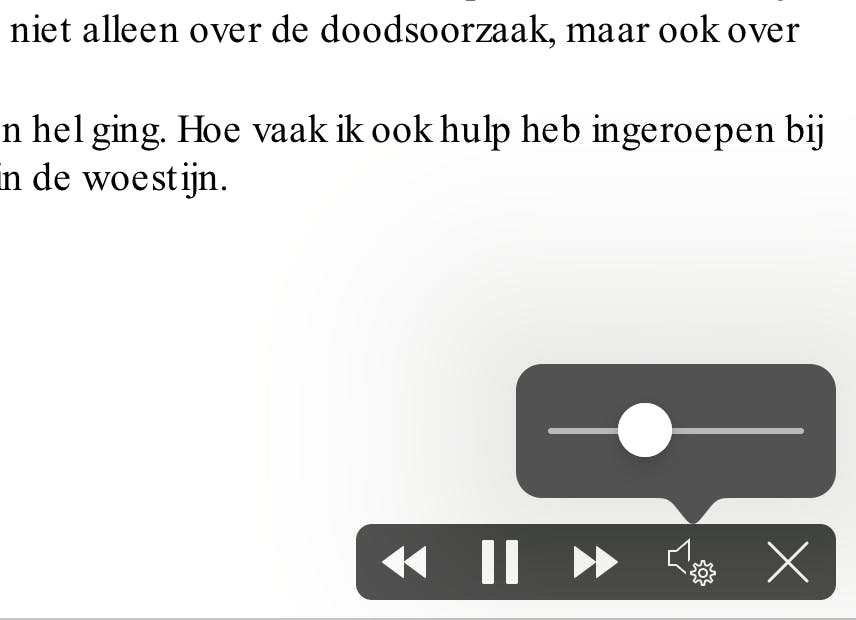 De uitspreekfunctie mist nog intonatie, maar onderaan rechts verschijnt een klein menu waarin je het spreken sneller en trager laat verlopen. Daarvoor dient de knop met het luidsprekertje en het tandwieltje. Je kunt het voorlezen ook pauzeren en vooruit- of achterwaarts sturen. Via het kruisje stopt het voorlezen. Dit menu blijft niet in beeld. Na een tijdje zal het een klein vierkantje worden dat aan de linkerkant van het scherm blijft staan, tot je het opnieuw opent.