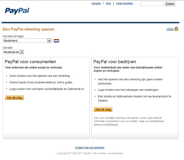 De eerste stap is dus het openen van een PayPal-rekening. Dit doet u door op de website te klikken op de knop Rekening openen. Dat kan onder andere op het tabblad Home of op het tabblad Particulier gebeuren. Een zakelijke rekening openen is ook mogelijk, maar dat valt buiten het kader van deze workshop. Controleer op het vervolgscherm of als land Nederland is geselecteerd en bij taal Nederlands staat ingevuld. Corrigeer waar nodig. Klik dan in het kader PayPal voor consumenten op de knop Aan de slag.