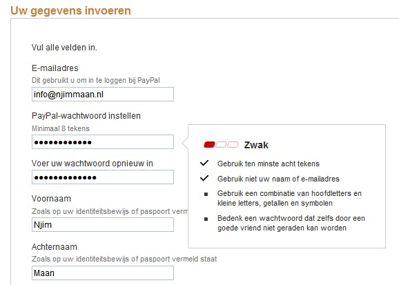 U krijgt een scherm te zien waarop u allerlei persoonlijke gegevens invult, zoals uw naam, telefoonnummer en adres. Ook geeft u hier een e-mailadres en een wachtwoord op. Die combinatie vormt de toegang tot uw PayPal-rekening. Meer hebt u niet nodig om wereldwijd producten te kopen en betalingen te verrichten. Kies een ijzersterk wachtwoord en zorg dat u het geheimhoudt. Zodra u alles hebt ingevuld en gecontroleerd, klikt u op Rekening openen. In principe is uw rekening nu geopend.