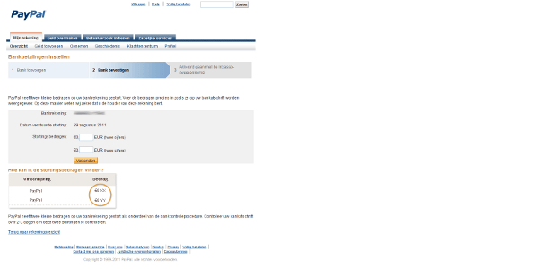 Hebt u een bankrekening aan uw PayPal-account gekoppeld? Om te controleren of die rekening echt van u is, maakt PayPal twee kleine bedragen naar u over. Dit kan enkele werkdagen duren. Kijk via internetbankieren of op uw bankafschrift wat deze bedragen zijn. Ga vervolgens naar uw PayPal-account en klik op het rekeningoverzicht in het kader Berichten op Bankrekening controleren. Voer de twee bedragen in en klik op Verzenden. Nu weet PayPal dat het inderdaad om uw rekening gaat. Vanaf dat moment kunnen de betalingen via uw bankrekening afgehandeld worden.