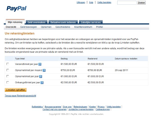 Uw rekening krijgt eerst de status niet-gecontroleerd en er gelden een aantal rekeninglimieten. Dit is te zien in de regel vlak onder uw naam op het rekeningoverzicht (oftewel het tabblad genaamd Overzicht). De limieten kunt u bekijken met een klik op Limieten weergeven. Pas zodra uw bankrekening bevestigd is met de twee willekeurige bedragen die PayPal heeft overgemaakt, vervallen de limieten en krijgt u de status van gecontroleerd rekeninghouder. Ook als u (alleen) een creditcard gebruikt, kunt u een soortgelijk bevestigingsproces doorlopen, zie stap 10.