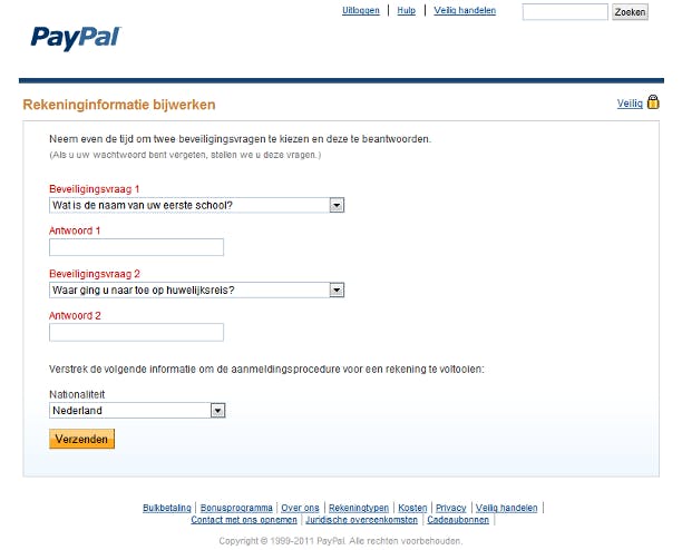PayPal stuurt een bericht waarmee u uw rekening moet activeren. Open de e-mail, klik op Mijn rekening activeren en meld u aan met uw wachtwoord. Aanvullend moet u twee beveiligingsvragen kiezen en beantwoorden. Mocht u een keer uw wachtwoord kwijt zijn, dan worden deze vragen aan u gesteld. Gebruik dus nooit informatie die anderen van u kunnen weten, of die eenvoudig te achterhalen is. Klik daarna op Verzenden. Eventueel kunt u nu alsnog een creditcard koppelen, of klik op Ga naar Mijn rekening. Uw rekening is nu geactiveerd.