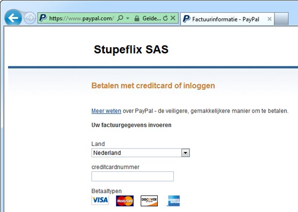 Zodra u als betaalmethode PayPal kiest, wordt u doorgeleid naar de PayPal-website om de betaling af te ronden. Controleer het webadres, let op of er een beveiligde verbinding actief is (https://www.paypal.com) en meld u dan aan met het e-mailadres en wachtwoord van uw PayPal-account. De betalingsgegevens verschijnen in beeld en nadat u alles op juistheid hebt gecontroleerd klikt u op Nu betalen. Wilt u bij nader inzien van de koop afzien, dan is vlak onder de betaalknop een redelijk onopvallend linkje te vinden waarmee u de koop alsnog kunt afblazen.