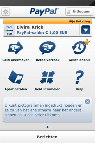 Voor iOS (Apple), Android en BlackBerry is in de betreffende app-winkel een handige app beschikbaar, zodat u ook met uw smartphone van PayPal gebruik kunt maken. We bespreken kort die van de iPhone, die van de andere besturingssystemen werken vergelijkbaar. Op het hoofdscherm bevinden zich pictogrammen, waaronder om geld over te maken, een betaalverzoek te doen en om transactiegegevens te bekijken. Grappig is dat de volgorde van de pictogrammen kan worden aangepast en dit gebeurt op nagenoeg dezelfde wijze als dat u al gewend bent te doen met de apps op de beginschermen van uw iPhone. Omdat het om een mobiel apparaat gaat, is het verstandig de inlogduur niet al te lang in te stellen. Wijzigen kan met het tandwieltje linksboven, kiezen voor Instellingen en dan Inlogduur. Via Pushberichten kunt u aangeven van welke gebeurtenissen u meteen een melding op uw mobiel wilt krijgen.