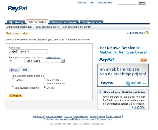 Via het tabblad Geld overmaken kunt u met de optie Online geld overmaken een bedrag op iemands account storten. U hebt hiervoor het e-mailadres van het PayPal-account van de begunstigde nodig. Vul het bedrag en eventueel de valutasoort in en kies een categorie. Op het vervolgscherm kunt u een berichtje intikken. Is uw creditcard het betaalmiddel, dan ziet u meteen welke kosten er aan de transactie verbonden zijn. Standaard draagt u de kosten. Laat u de ontvanger ervoor opdraaien, dan ontvangt de begunstigde de storting minus de kosten.