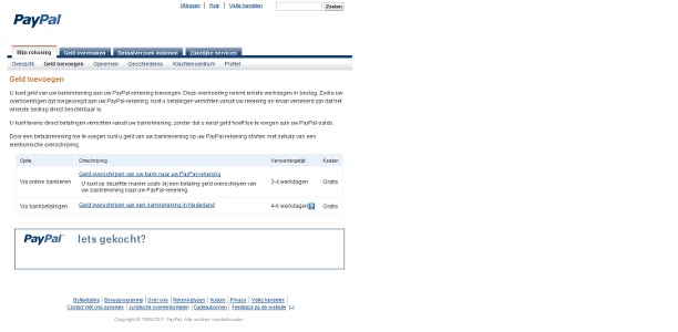 Een PayPal-rekening kan een saldo hebben. Zodoende kunt u er rechtsreeks betalingen mee doen. Kies om het saldo aan te vullen op tabblad Mijn rekening in de werkbalk eronder voor Geld toevoegen. Aanvullen kan op twee manieren. Allereerst met online bankieren. In dat geval geeft PayPal u exacte instructies hoe u dit via een normale overschrijving via uw eigen bankrekening kunt doen. Als alternatief kunt u PayPal een betaalverzoek naar uw bank laten versturen. Voor deze optie is het wel nodig dat de bankrekening aan uw PayPal-account is gekoppeld.