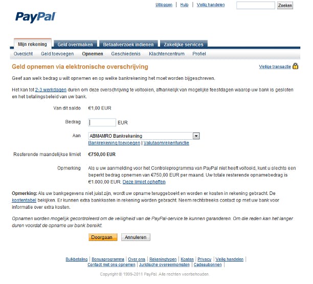 Het kan ook gebeuren dat u juist geld wilt overboeken van PayPal naar uw bankrekening. Dat kan geld zijn dat u eerder op uw PayPal-rekening hebt gestort, maar ook geld dat u van anderen hebt ontvangen, bijveeld na het verkopen van spullen op Marktplaats. Kies voor het tabblad Mijn rekening / Opnemen en vervolgens Geld overschrijven naar uw bankrekening. Vul het bedrag in, selecteer de juiste rekening en klik op Doorgaan. Het duurt enkele dagen voordat het bedrag op uw bankrekening zichtbaar is.