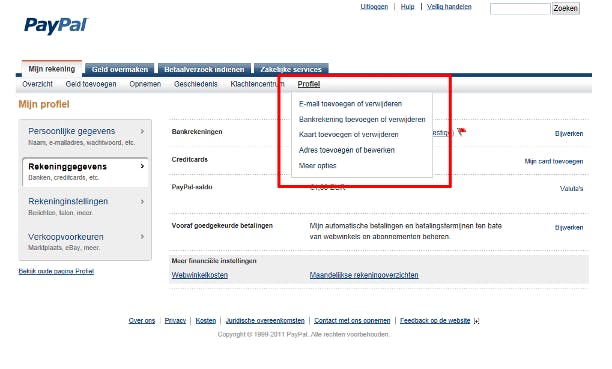 Via de optie Profiel (wederom onder Mijn rekening) kunt u uw persoonlijke gegevens bijwerken, e-mailadressen aanpassen of toevoegen en uw gekoppelde creditcards en bankrekeningen beheren. Met een klik op de optie Profiel krijgt u een scherm met uitgebreide mogelijkheden te zien, wat vooral handig is als u meerdere acties wilt uitvoeren. Als alternatief kunt u de muis op de keuze Profiel laten zweven. In dat geval verschijnt er eerst een submenu en kunt u meteen naar een bepaald onderdeel springen. Bijvoorbeeld Bankrekening toevoegen of verwijderen.