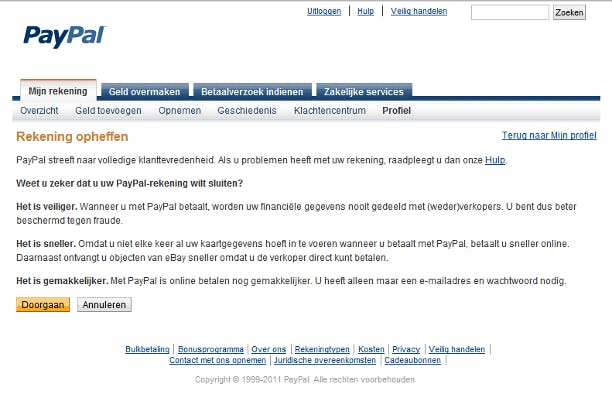 Mocht u ooit besluiten om uw PayPal-rekening op te heffen, dan moet u ook op de profielpagina zijn. Klik op Mijn rekening / Profiel, ga naar Rekeninginstellingen en klik achter Rekeningtype op Rekening opheffen. U zult er diverse schermen moeten doorlopen waarop wordt nagegaan of u wel echt wilt stoppen. Als u zich nergens onderweg bedenkt, krijgt u tot slot een bevestiging per e-mail. Het is handig om een eventueel saldo eerst naar uw bankrekening over te maken. Wellicht wilt u ook het transactieoverzicht veiligstellen (zie stap 16).