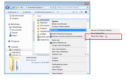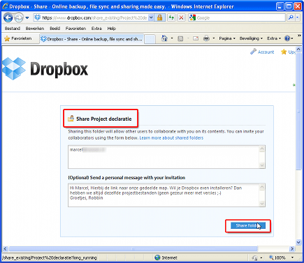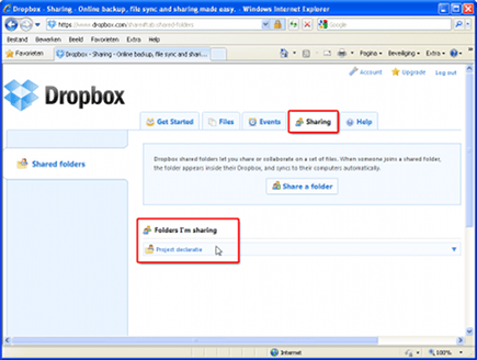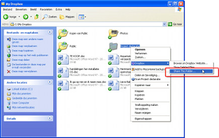 Dropbox biedt de mogelijkheid om de inhoud van een willekeurige map te delen met anderen. Hiervoor wordt een uitnodiging verstuurd per mail. Als de ontvanger nog geen Dropbox heeft, kan hij een account aanmaken. De map verschijnt automatisch in de My Dropbox-map van de ontvanger. Ga naar C:\My Dropbox en maak een nieuwe map aan. Klik met rechts op deze map en kies Share this folder. Uw browser wordt opgestart en u logt automatisch in op uw persoonlijke Dropbox-pagina op internet.