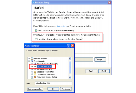 Dropbox werkt onder Windows, Linux en Mac OS, en er is ook een iPhone-app. Ga naar Dropbox en installeer het programma via Download Dropbox. Kies voor I don't have a Dropbox account en doorloop de registratie. Dropbox maakt standaard de map My Dropbox aan in (Mijn) Documenten. Om problemen met paden te voorkomen, is het verstandig om deze map aan te passen zodat uw Dropbox op elke computer hetzelfde pad heeft. Kies voor I want to choose where to put my Dropbox folder en wijs uw C-schijf aan. Uw Dropbox-map is zo bereikbaar via C:\My Dropbox.