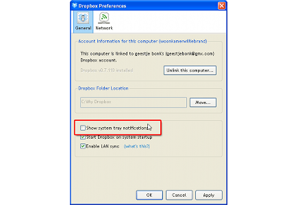 Telkens wanneer uw Dropbox één of meer bestanden bijwerkt op uw computer, krijgt u hiervan een pop-upmelding. Deze optie is standaard actief, maar kan bij veelvuldig gebruik behoorlijk hinderlijk zijn. Open de instellingen van uw Dropbox en verwijder het vinkje bij Show system tray notifications. Zodoende wordt de stille modus actief. Als u toch wilt zien wat er zoal in uw Dropbox wordt bijgewerkt, klikt u met rechts op het Dropbox-icoontje. Achter de optie Recently changed files ziet u welke bestanden het laatst zijn bijgewerkt.