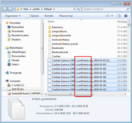 Een groot voordeel is dat u altijd een reservekopie hebt van vorige bestandsversies. Klik met rechts op een bestand waarvan u een eerdere versie wilt herstellen en kies Dropbox / View previous versions. Uw browser wordt gestart en u ziet precies wanneer en door wie het bestand is aangepast. Vink een oudere versie aan en kies Restore. De vorige versie wordt hersteld op de originele locatie in My Dropbox.
