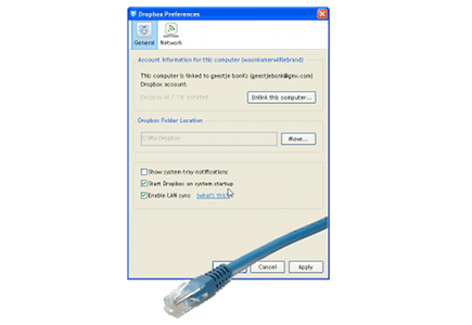 Het synchroniseren van de map My Dropbox (en eventueel de mappen die u deelt met anderen) verloopt via internet. Dit heeft als voordeel dat uw Dropbox overal wordt bijgewerkt waar u een actieve internetverbinding hebt. Als de computers zich in hetzelfde (draadloze) netwerk bevinden, gaat het synchroniseren nog sneller dankzij LAN sync. Open de instellingen van uw Dropbox (zie vorige stap) en zorg ervoor dat Enable LAN sync aangevinkt is. Als u bijvoorbeeld uw notebook en desktop-pc gelijktijdig aan hebt staan, worden wijzigingen 'intern' verwerkt.