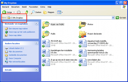 De map My Dropbox is een 'echte' map, en dus kunt u deze eenvoudig openen. Blader via Start / (Deze) Computer naar uw C-schijf en open de map door erop te dubbelklikken. Maak eventueel een snelkoppeling aan op uw bureaublad (standaard actief na installatie). Als u geen liefhebber bent van extra icoontjes op uw desktop, kunt u de map My Dropbox ook openen via het Dropbox-icoontje in uw systeemvak. Dubbelklik hierop en de inhoud van de map wordt getoond in de Verkenner.