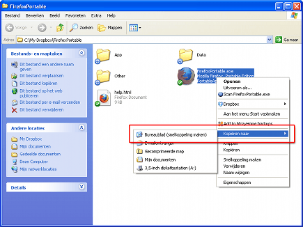 Portable apps hoeft u niet te installeren: uitpakken via de speciale wizard volstaat. Let op dat u de juiste map kiest! Standaard is dit \FirefoxPortable. Verander dit in C:\My Dropbox\FirefoxPortable. Open deze map via Start / (Deze) Computer en klik met rechts op FirefoxPortable.exe. Kies Kopiëren naar / Bureaublad snelkoppeling. Start de portable versie één keer op en sluit deze weer af. Op uw andere computers komen de bestanden van de Firefox-browser automatisch binnen; u hoeft alleen nog een snelkoppeling aan te maken.