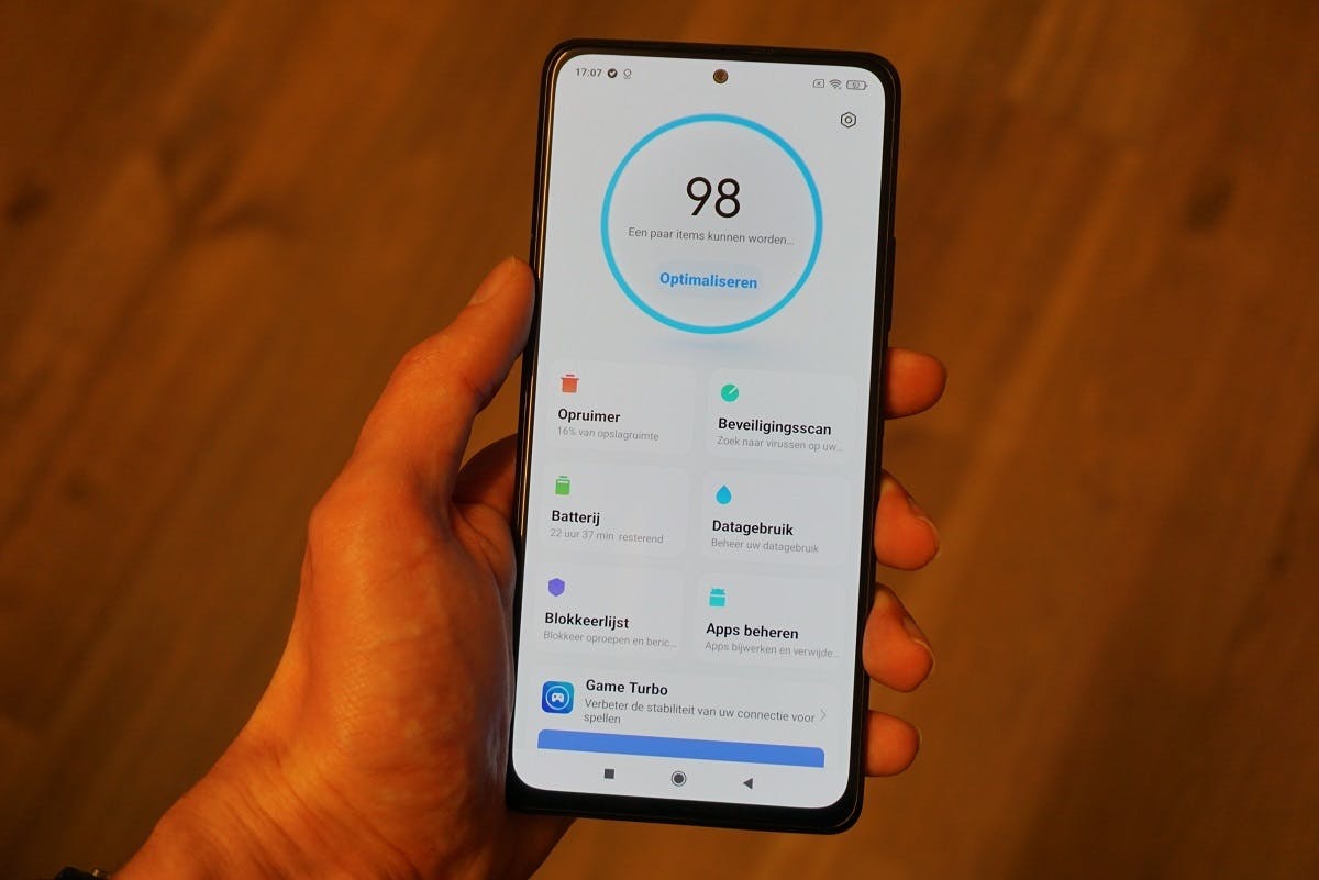 De Redmi Note 10 Pro heeft een voorkantvullend scherm met bovenin een klein gaatje voor de selfiecamera. Op de rechterzijkant tref je de aan- en uitknop met geïntegreerde vingerafdrukscanner aan. De scanner is betrouwbaar en snel. Door de grote camerabult op de achterkant ligt de smartphone niet vlak op tafel. Dat is vervelend bij het typen. Ik pak het toestel daarom maar op. Positief zijn de stereo luidsprekers aan de boven- en onderkant. Die produceren duidelijk stereogeluid en kunnen flink hard. Verwacht alleen niet veel bas.