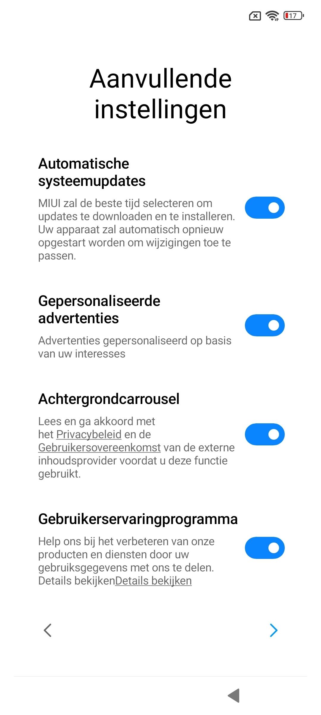 Ook vervelend is dat Xiaomi bij het instellen van de smartphone allemaal aanvullende instellingen presenteert die uit zijn op extra informatie van jou. Denk aan het doorsturen van gebruikersgegevens en het tonen van gepersonaliseerde advertenties. Als je die gepersonaliseerde advertenties uitschakelt, kun je nog steeds - algemene - advertenties in de software tegenkomen. Jammer, helemaal omdat je ze niet eenmalig kunt afkopen.