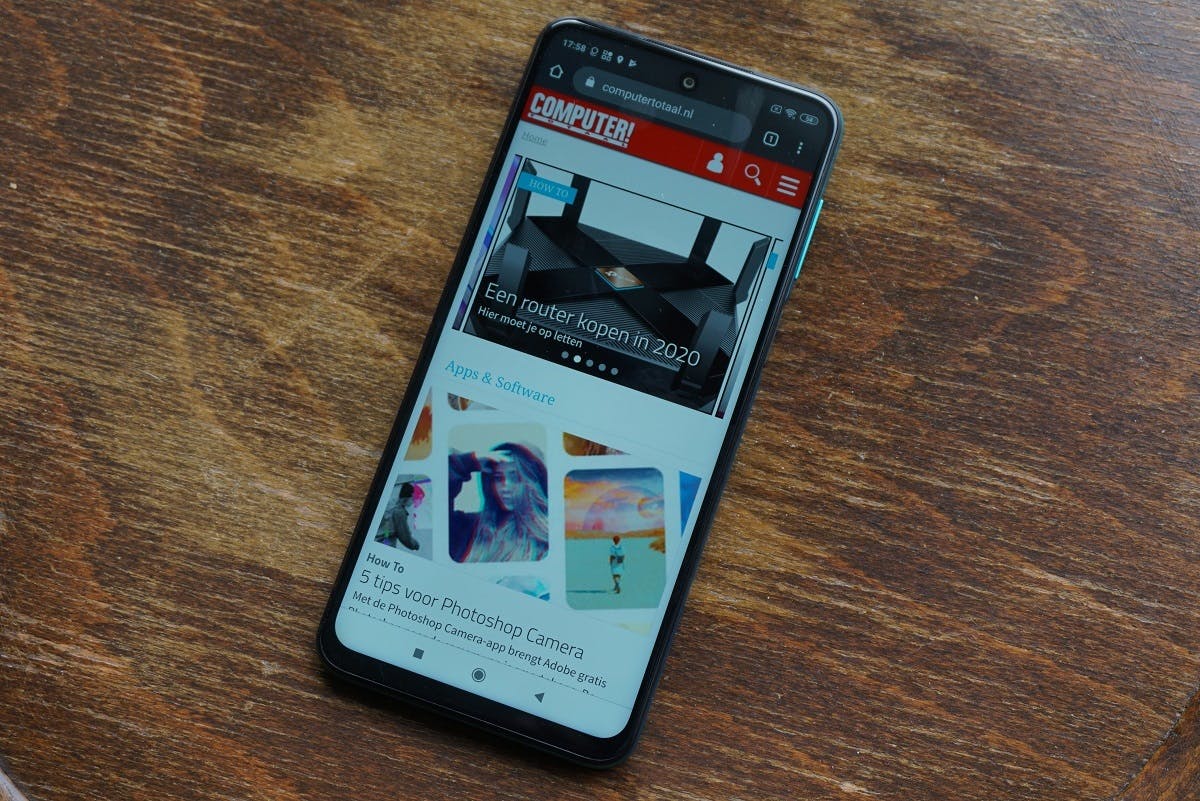 Het scherm van de Redmi Note 9 Pro is met 6,67 inch groter dan gemiddeld en dat merk je. Ik kan de smartphone bijvoorbeeld niet met één hand bedienen. Het flinke scherm leent zich wel uitstekend voor typen met twee handen, gamen en het kijken van films. Door de full-hd-resolutie oogt het beeld scherp. Het lcd-paneel levert prima kleuren en een hoge helderheid, maar kan niet tippen aan het oled-scherm van een vergelijkbare Samsung-smartphone. In een gaatje in het scherm zit een 16 megapixel camera die ‘gewoon goede’ selfies schiet.