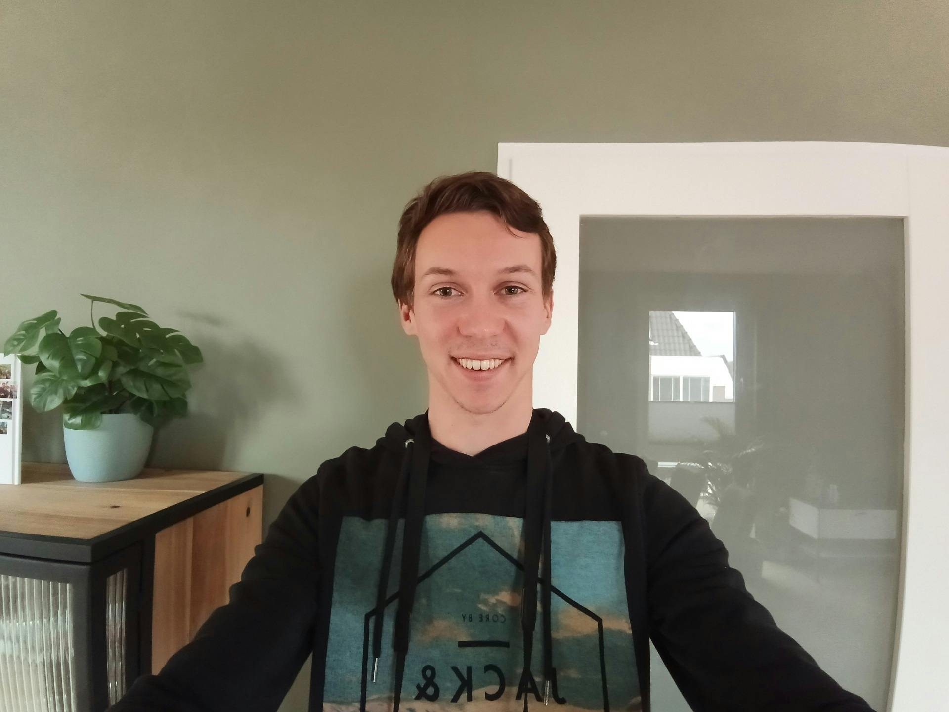 De Redmi Pad heeft een selfiecamera op de lange zijde, subtiel weggewerkt in de schermrand. Een slimme keuze als je videobelt en de tablet horizontaal vasthoudt of neerzet. Je bent dan horizontaal beter in beeld. En laten we wel wezen; veel mensen gebruiken een tablet horizontaal. De kwaliteit van de 8megapixel-selfiecamera is prima bij genoeg licht en het gezichtsveld van de camera is opvallend groot. Zo komt er een groter deel van je omgeving in beeld. Op onderstaande foto houd ik de tablet zo’n veertig centimeter van mijn gezicht af, maar het lijkt meer op een meter.