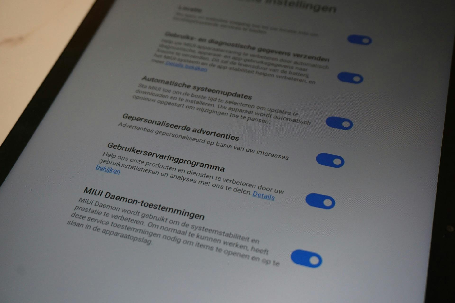Let er bij de installatie van de tablet ook waar je automatisch akkoord mee gaat. Xiaomi zet vinkjes bij allerlei instellingen die gegevens doorsturen en jou gepersonaliseerde reclames voorschotelen. Je kunt deze vinkjes gelukkig uitzetten.