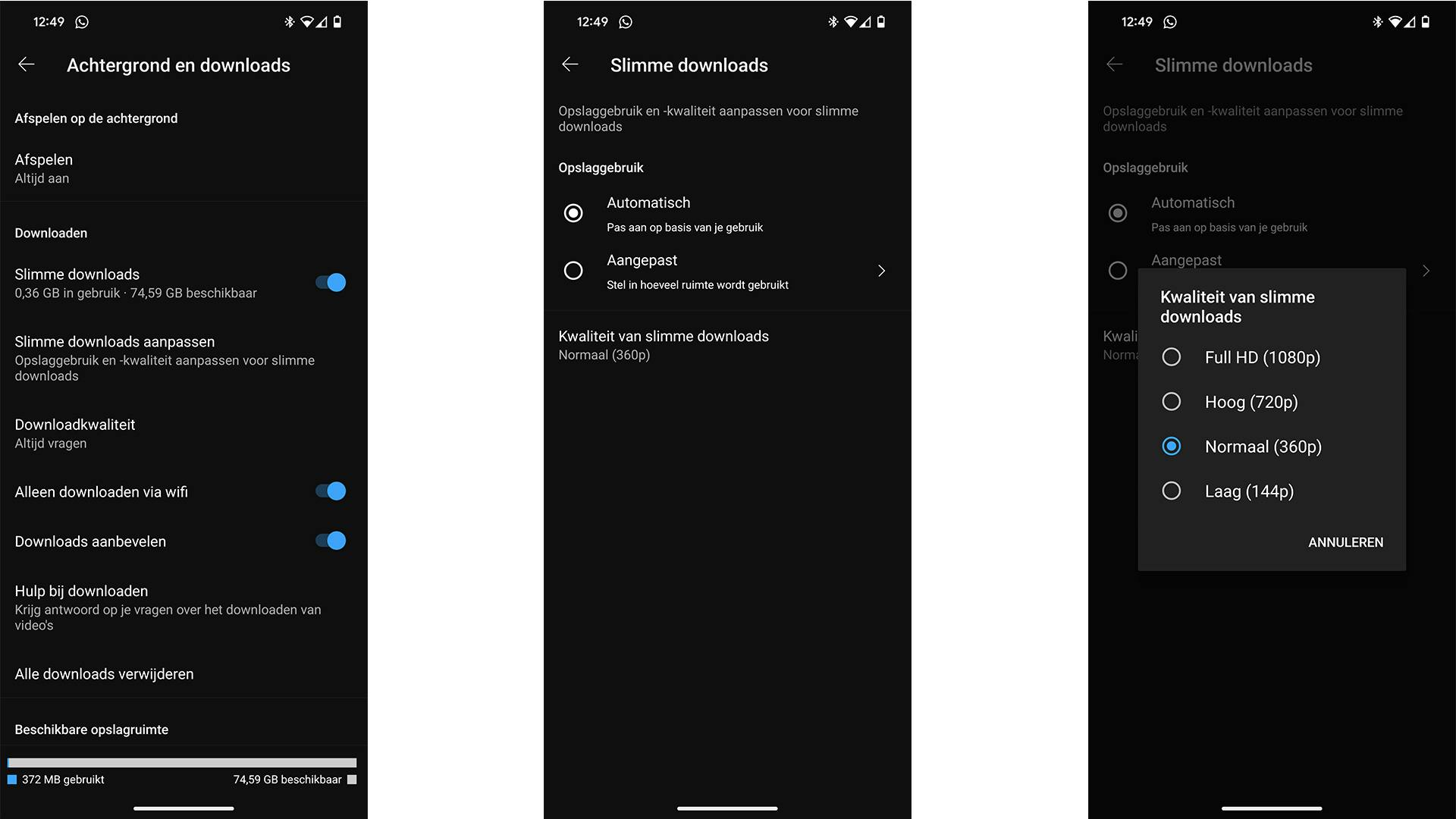 In plaats daarvan kun je onder Slimme downloads aanpassen zelf bepalen in hoeverre de YouTube-app ruimte mag innemen. Je hebt twee opties: Automatisch (dan past de app zich aan op basis van je gebruik) en Aangepast (dan stel je een maximale hoeveelheid ruimte in die de app mag gebruiken). Onderop tref je nog het kopje Kwaliteit van slimme downloads. Daar kun je aangeven wat de resolutie van de video’s moet zijn. Hoe lager de resolutie, hoe minder ruimte een video zal innemen.